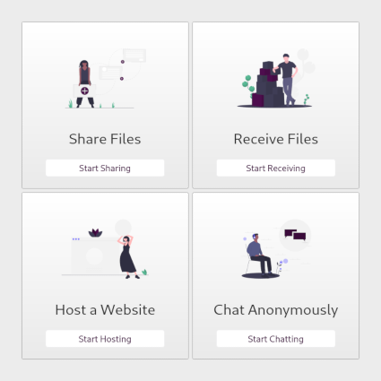 From the welcome screen of OnionShare, you can choose between 4 different services: